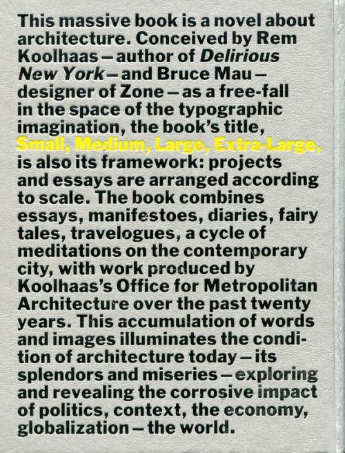 A mammoth compendium of 20 years of OMA's projects, arranged in order of size, S,M,L,XL gives an insight into the restless, ingenuitive thinking of the office through an era when architecture became a mere bystander to the explosion of the market economy and globalization.